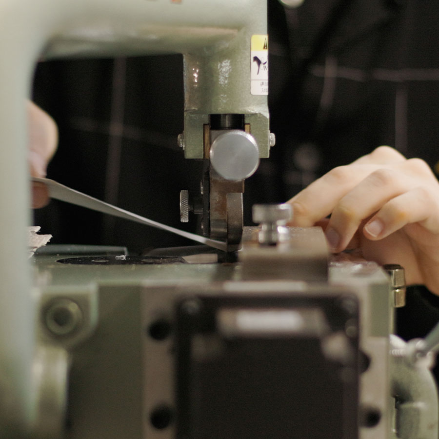 Nenbiki(Leather edge creasing) is used in the luxury men's lines, and is an important pass that greatly enhances the appearance and final finish. Furthermore, it also makes the edges of the product more resilient. These lines run adjacent to stitches and give a clean impression to enhance the look of the finished product.